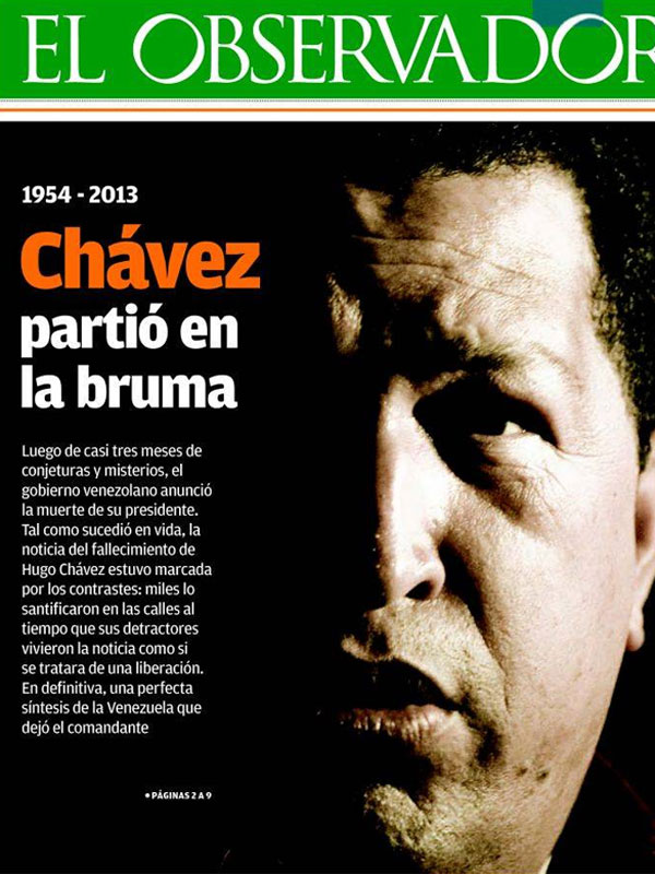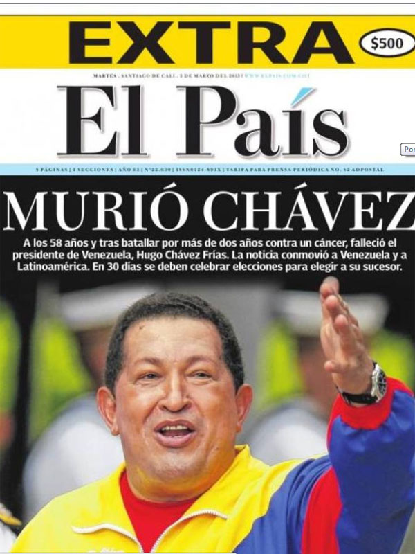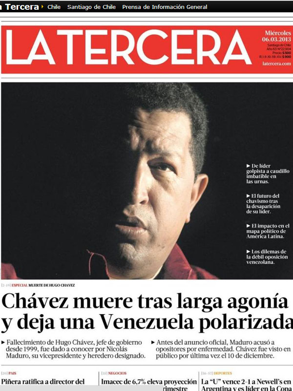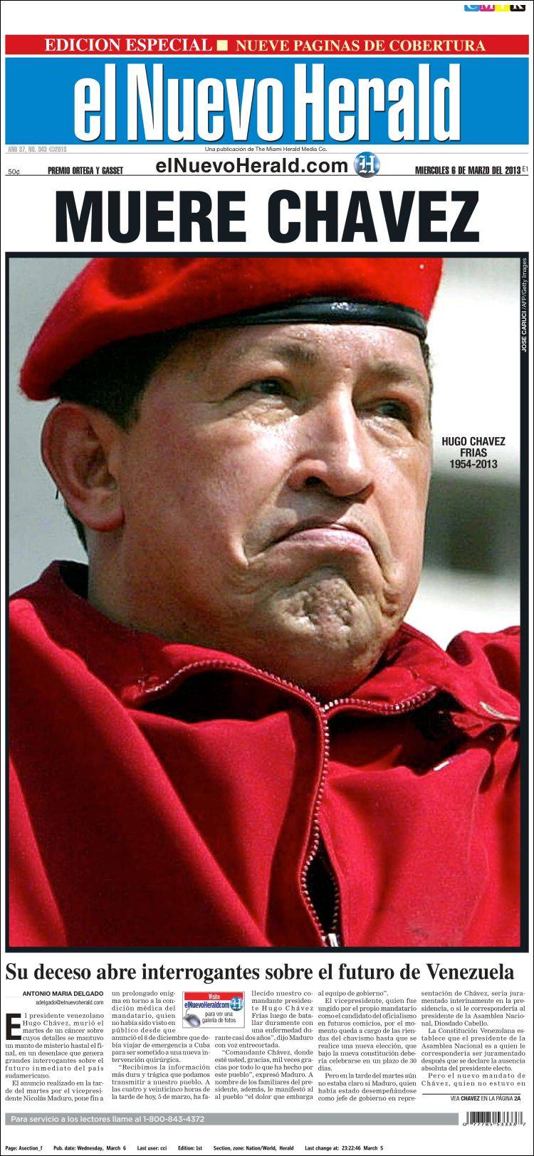 ¡Murió! Así título del diario mexicano La Prensa, mientras que muy distinta fue la postura que eligió El Expreso: “Muere Hugo Chávez. No superó el cáncer tras cuatro cirugías”.