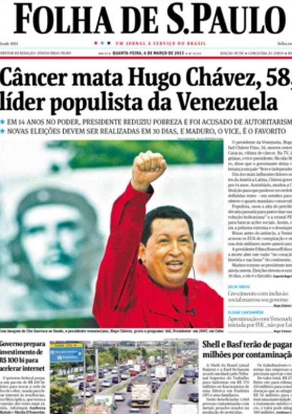 En la región, el brasileño Folha De S.Paulo optó por resaltar la figura victoriosa del líder chavista durante un acto, donde sobresale al mismo tiempo la imagen del Che Guevara bajo el título: “El cáncer mata a Hugo Chávez, líder popular de Venezuela”. “El fin de una era”, rotuló contundente el periódico Correio Braziliense.