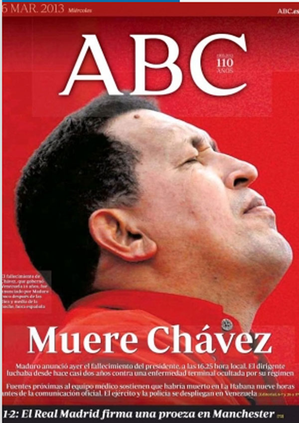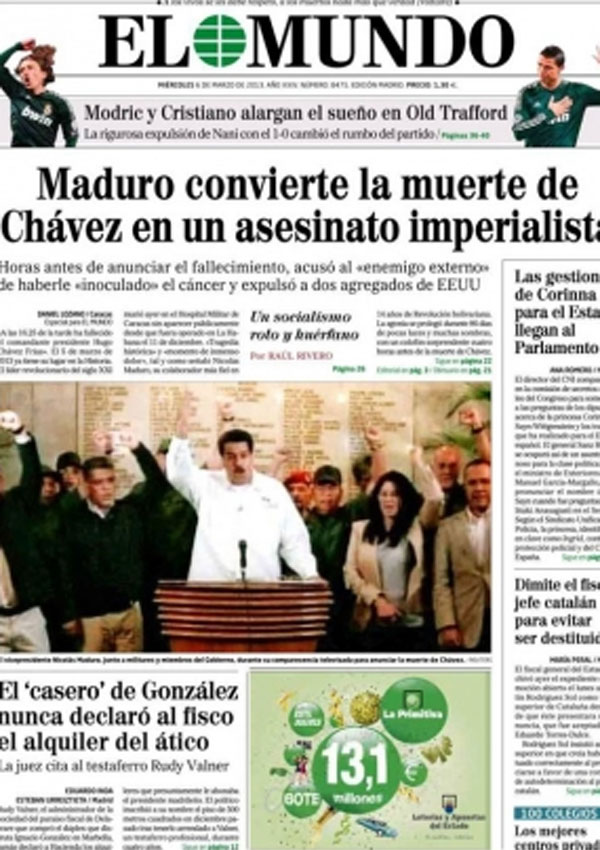 Cada uno de ellos eligió graficar el fallecimiento de acuerdo a su editorial o bien manteniendo un perfil neutro. Así, mientras el diario español El Mundo tituló “Maduro convierte la muerte de Chávez en un asesinato imperialista”, el periódicoThe New York Times optó por “Chávez muere a los 58 años con Venezuela en una gran confusión”.