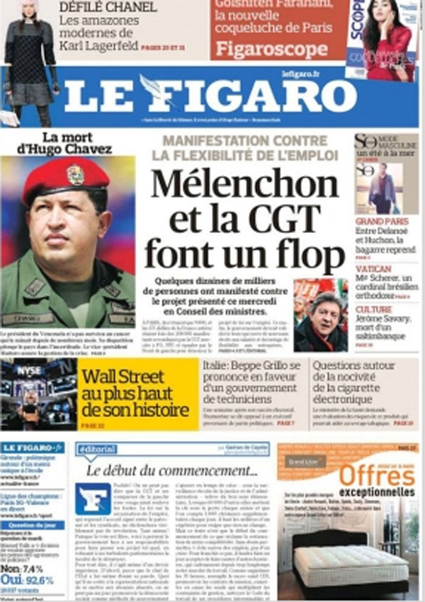 The Independent tituló "Muere Chávez" y acompañó la noticia con una importante foto del mandatario mientras el otro diario inglés relevante, The Guardian, evitó hacer referencia al tema, al menos en su tapa. Algo similar ocurre en Francia. El prestigioso Le Monde, que en su versión digital desplegó una amplia cobertura, en su edición papel la muerte de Chávez no figura en su portada. Por el contrario, el otro diario reconocido, Le Figaro, sí puso a Venezuela como uno de los principales temas de su tapa.