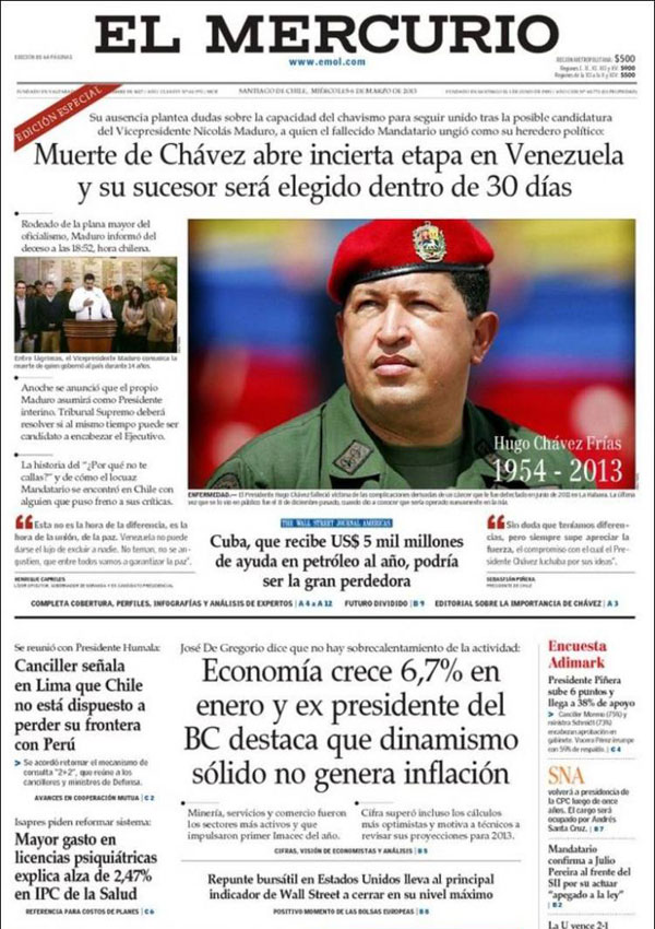 El diario chileno El Mercurio también fue directo en su opinión al titular: “La muerte de Chávez abre incierta etapa en Venezuela”. La tapa lleva la chapa de “Edición especial”. Sobre la incertidumbre también reparó en el título el diario uruguayo El País, que dedicó su tapa de forma completa al adiós del mandatario bolivariano en una edición "extra", mientras que El Observador escribió: "Chávez partió en la bruma”, también como único tema de su portada.
