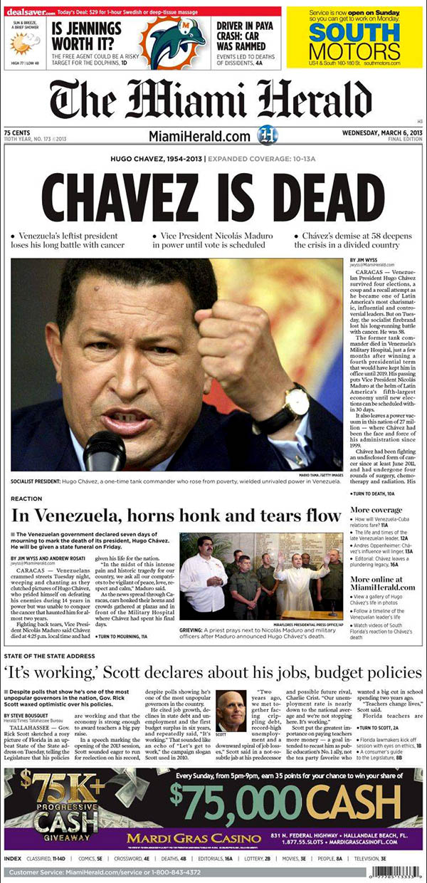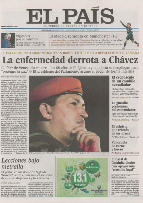 The Washington Post, en cambio, fue firme al decir “Ha muerto el líder que prometía la revolución antinorteamericana”. En España, a su vez, la muerte del líder bolivariano fue tema de todos los matutinos impresos de este miércoles, algo que no ocurrió en Gran Bretaña, por ejemplo. Allí, sólo algunos periódicos informaron sobre el tema en sus portadas.