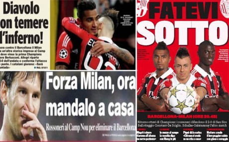De la misma manera, el diario ‘Corriere dello Sport’ señala que "es la hora de mandarlos a casa" con una foto de Messi preocupado y un gran "Forza Milan", También ‘Tuttosport’ abre su edición con Boateng y el Shaarawy y envía un épico mensaje: "Los diablos no temen al infierno".