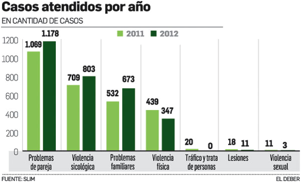 En los Servicios Legales Integrales Municipales (SLIM), en los últimos cinco años, se han atendido 18.194 casos, la mayoría de problemas en la pareja y de maltrato físico y sicológico. De igual forma, los datos de la Casa de la Mujer engrosan más las cifras, porque durante el año pasado en esta organización no gubernamental se atendieron 3.637 hechos, donde resaltan las mismas agresiones, sumadas también a la violencia sexual.