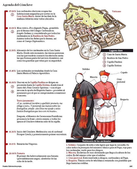 El Cónclave dará comienzo a las cuatro y media de la tarde. El portavoz del Vaticano explicó una novedad en el ritual, promovida por Benedicto XVI. El nuevo Papa podrá disfrutar una pausa de plegaria silenciosa ante el Santísimo Sacramento antes de salir al balcón para su primer saludo a los fieles. Una bocanada de oxígeno muy necesaria en esos momentos.