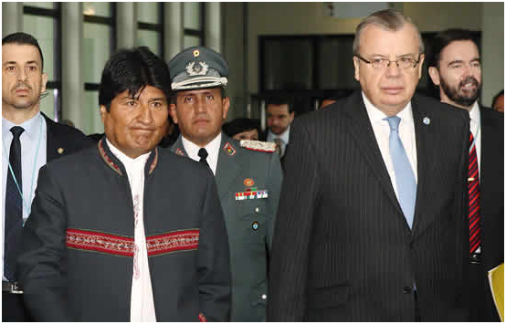 El presidente de Bolivia, Evo Morales junto a Yury Fedotov, director ejecutivo de la Unidad Contra la Droga y el Delito en la sede de la ONU en Viena. Foto: Reuters