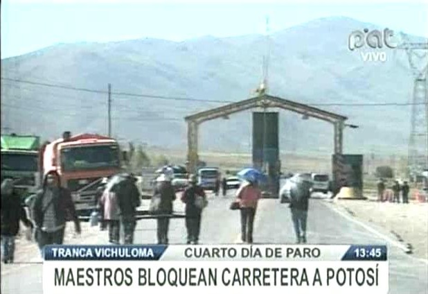 “Somos más de 300 profesores que estamos aquí bloqueando todo el distrito de Huanuni en el cruce de Machacamarca. Por situaciones de estrategia todavía no estamos sacando esta decisión, pero muy posiblemente esto sea incluso toda la noche, hasta que se soluciones este problema”, indicó un representante.