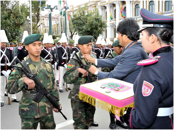 Lunes 04 de marzo de 2013. El presidente Evo Morales condecora y asciende a los tres dragoneantes detenidos en Chile. (Foto ABI)