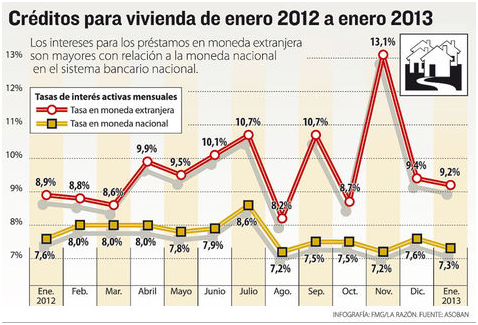 La Razón / La Paz.- El Gobierno informó que las tasas de interés de los créditos para la compra de casas de hasta $us 120 mil y para departamentos de hasta $us 100 mil que otorgue el sistema financiero serán reguladas. Los créditos de los montos mayores a esas cifras serán fijados por la banca.