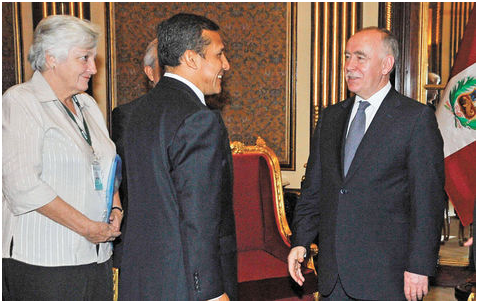 Encuentro. El zar antidrogas de Rusia, Victor Ivanov (der.) frente al presidente de Perú, Ollanta Humala, en una reunión sostenida el lunes en Lima. EFE.