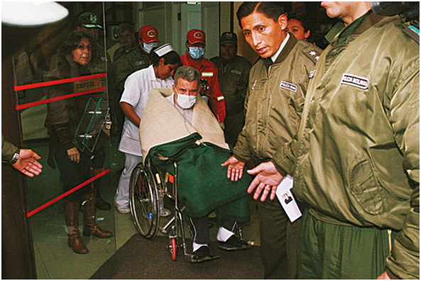 Cinco minutos después, llegó el abogado Brito y Pamela, hija de Fernández, quienes realizaron los trámites en la clínica. Eran las 18:00 cuando Leopoldo salía en silla de ruedas, directo a la ambulancia, sin emitir una sola palabra. Para subir, se paró un momento, pero se notó la debilidad en el cuerpo del hombre. La caravana salió de la zona de San Jorge, se desvió hacia Llojeta, siguió viaje de 12 kilómetros por la avenida  Costanera hasta llegar a la calle 35 de la zona de Cota Cota.