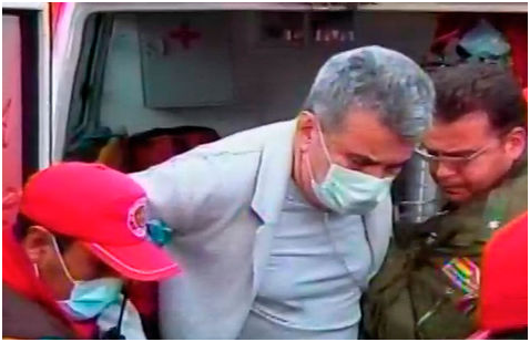 El exprefecto salió de la clínica montado en una silla de ruedas, con el rostro cubierto con un barbijo, el pelo más canoso, vestía una bata de hospital y un buzo azul. Los efectivos de la Unidad de Bomberos que le ayudaron y le trasladaron hasta su domicilio portaban un tanque de oxígeno que le ayudaba a respirar.