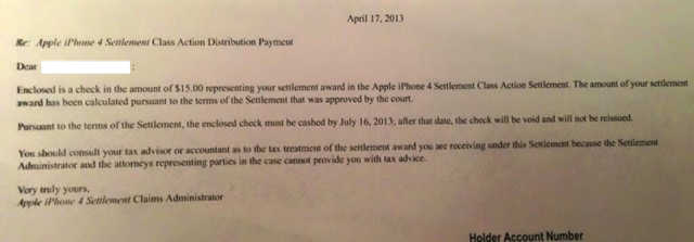 Según podemos leer en 9to5Mac, los poseedores de un iPhone 4 que no recibieron en su momento el bumper de regalo que envió Apple y que realizaron su reclamación a la compañía en su momento, ya que ahora ya no se puede, empiezan a recibir una carta de la empresa de Cupertino acompañada de un cheque al portador de 15 dólares que deben cobrar antes del 16 de julio.