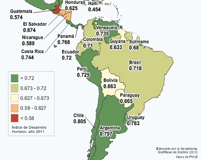 Del 2011 al 2012, el país aparece estancado en el mismo puesto del ranking mundial de Desarrollo Humano: el lugar 108. En contraste, el mejor sitial en América Latina lo ostenta Chile, en el lugar número 40, de donde habrá que deducir que la economía libre y no el intervencionismo estatal es el ambiente más amigable para el mejoramiento de la calidad de vida.