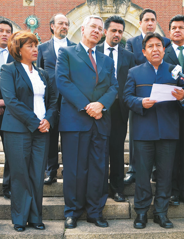 Autoridades bolivianas cuando daban a conocer la presentación de la demanda ante la Corte en Holanda. Foto: ABI