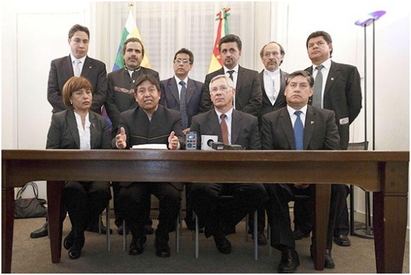 El canciller David Choquehuanca y su equipo jurídico, en conferencia de prensa en La Haya, el miécoles pasado. Efe.