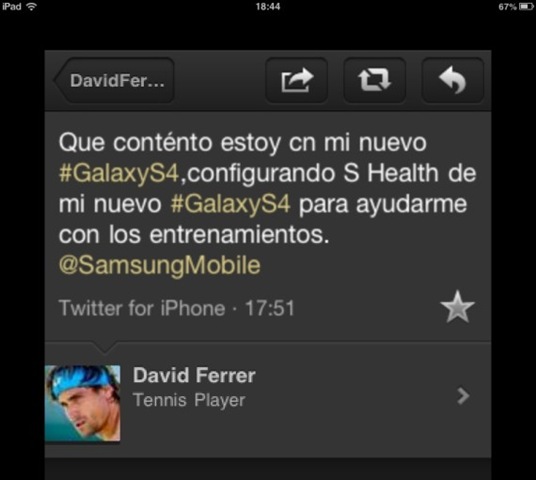 Menudo revés ha dado David Ferrer a Samsung. El tenista alicantino mostró su alegría por haberse comprado el nuevo Samsung Galaxy S4 y no se le ocurrió mejor forma que hacerlo desde su iPhone.