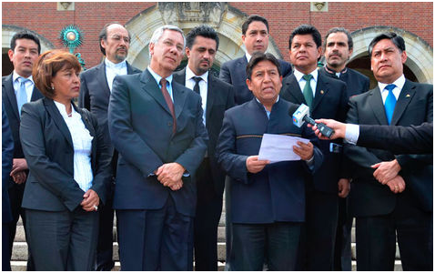 Junto a Rodríguez y Choquehuanca, estuvieron en La Haya el ministro de Defensa, Rubén Saavedra; la ministra de Transparencia, Nardi Suxo, el titular de la Dirección de Reivindicación Marítima (Diremar), Juan Lanchipa; el procurador general, Hugo Montero; el embajador boliviano ante las Naciones Unidas, Sacha Llorenti, y el diputado por el MAS Héctor Arce.