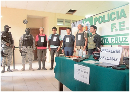 Desarticulación con éxito. Después del 2011, cuando ejercía como jefe departamental antidroga el teniente coronel Rubén Suárez, que saldó durante una operación en la Chiquitania con más de 22 colombianos detenidos, que ya fueron liberados, la operación Las Lomas cobra notoriedad por la cantidad de extranjeros arrestados. Los narcos que guardaron en silencio la identificación del líder de la organización narco, dijeron que iban a ganar en el laboratorio por kilo elaborado de cocaína 5 dólares. Los detenidos fueron identificados como Ever Ardey Martínez Mora (30), Juan Eusebio Vélez Durán (38), Cristian Hisnardo Hoyos Figueroa (25), Edison Elmer Rivera Martínez (24), Mauricio Mahechi Marcelo (43), Elkin Alonso Gonzales Cárdenas (39), Félix Enrique Cabrera Rodríguez (32), Amparo Rincón Rodríguez (24), Miguel Andrés Balsero Tobar (22), Edison Gonzales Cortés (32) y Primitivo Lijerón Bruno (55) (boliviano).