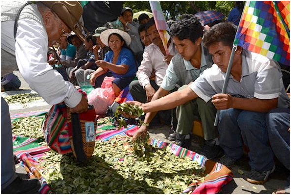 Productores de coca realizan un acto de reivindicación de la coca en la plaza principal de Cochabamba, a principios de año. Los Tiempos