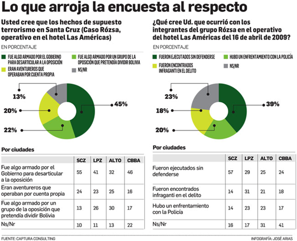 Como era de esperarse, es en Santa Cruz donde la mayoría (55%) piensa que el Gobierno tuvo que ver en los sucesos del 16 de abril de 2009 en el hotel Las Américas. Gran parte de los que así opinan son hombres de clase media, cuyas edades oscilan entre los 26 y 40 años. Mientras que en El Alto están los que piensan (30%) que la oposición sí articuló ese grupo terrorista.