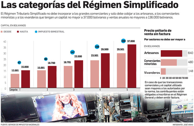 Actualmente, los artesanos, comerciantes minoristas y vivanderos del RTS pagan tributo, cada dos meses, entre Bs 47 y 200, según la categoría a la que pertenecen. En este régimen hay cinco categorías, por lo que los pagos bimensuales son de Bs 47, 90, 147, 158 y 200 respectivamente (ver cuadro).