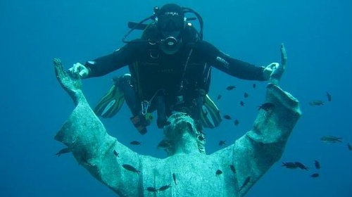 El Cristo del Abismo en Italia. Fue colocado en el verano de 1954, a unos 17 metros de profundidad, mide 2,5 metros. "Il Cristo degli Abissi" fue creado por Guido Galletti a partir de una idea del submarinista italiano Duilio Marcante. Cada verano, decenas de buceadores acuden a esta catedral bajo el agua.