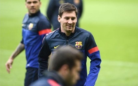 Sonriente y sin molestias aparentes por la lesión en el bíceps femoral de la pierna derecha que arrastra desde el 2 de abril, Messi empezó la sesión vespertina en un ‘rondo’ junto a Abidal, Jordi Alba, Alexis, Thiago, Alves, Dos Santos, Montoya, Pinto y Oier, e incluso disparó a puerta en algún momento de distensión.