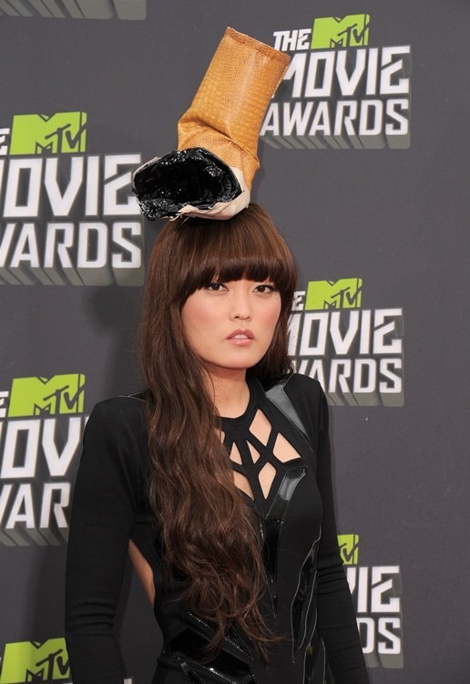 ¿Se le echa de menos a Lady Gaga en estos eventos? Pues si andamos con ganas de ver a famosas con tantas ganas de ser originales, nos podemos conformar con Hana Mae Lee y su tocado de una colilla en la cabeza. ¿A qué se debe? ¿Una forma de protestar por la prohibición de fumar? Ni idea. Su vestido negro de Marco Marco no está de mal, pero ¿quién se fijará en él?