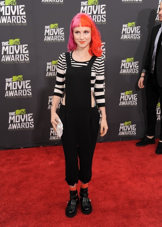 Visto lo visto, el atuendo de Hayley Williams hasta me hace gracia. El buzo de Zara conjuntado con el top corto de rayas de Topshop tiene su punto, pero me chirría un poco más su melena medio fucsia, medio naranja, combinada con los calcetines y con . Algunas ya no saben ni que hacer para no pasar desapercibidas.