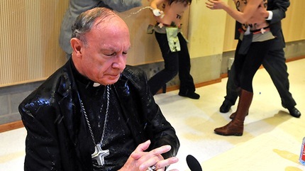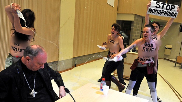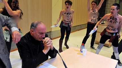 Activistas del grupo Femen atacaron a la cabeza de la Iglesia católica belga, el arzobispo André-Joseph Léonard. Durante un discurso de condena del matrimonio entre parejas del mismo sexo en Francia, las mujeres en toples le echaron agua.