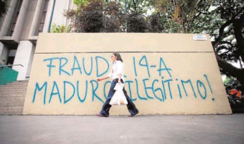 EFE Una mujer camina junto a un cartel en el que se denuncia fraude electoral, la semana pasada en Caracas