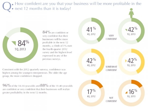 Un 84% de los empresarios encuestados se mostró confiado o muy confiado de que su negocio será más rentable en los próximos 12 meses, un punto por encima de lo reflejado en el pasado estudio del último trimestre de 2012.