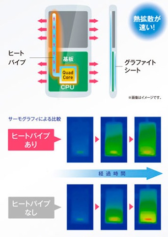 Este circuito es un tanto especial puesto que no existe radiador ni ventilación para que el fluido desprenda la energía calorífica, sino que es la propia carcasa metálica la encargada de disipar el calor. Una ventaja de este sistema es que el calor se expande a lo largo y ancho de la carcasa, eliminando la sensación de calor centralizado en un punto (normalmente donde se coloca el procesador). Aunque desconocemos si el circuito dispone de algún método que permita el movimiento del fluido por el sistema, éste se posiciona más efectivo que la refrigeración pasiva de los actuales modelos. Esto significa que el resto de modelos disponibles en el mercado disipan el calor mediante el contacto con el aire.En cuanto a las características técnicas, el Nec X N-06 se compone de una pantalla de 4.7 pulgadas, procesador Qualcomm Snapdragon S4 Pro a 1.7 GHz, 2 GB de memoria RAM, cámara de 13 megapíxeles con sensor Sony Exmor RS y conectividad LTE. Por ahora se desconoce si el modelo podría comercializarse en otros mercados y el precio de partida.