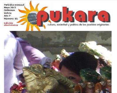 El número 81 de la publicación indianista Pukara incluye en su temario:Editorial:El tema del mar: ¿Callejón sin salida?Bolivia presentó su demanda contra Chile en la Corte Internacional de Justicia en términos que parecen no ser los más adecuados para lograr una salida soberana al mar.El tema del mes:El desarrollo, el progreso, los andinos y la cosmovisión que se les atribuyeEn su artículo Los andinos y la cosmovisión que se les atribuye, Carlos Macusaya repasa las principales características de una moda ideológica que hace que muchos defiendan una impostura como si se tratase de su verdadera identidad. Por su parte, en el artículo Desarrollo, progreso y cosmovisión: mitos y realidades, Pedro Portugal Mollinedo indica cómo los resortes profundos del pensamiento andino no están vinculados a los prejuicios posmodernos de equilibrio con la naturaleza sino más bien a los universales de comprensión racional y transformación del entorno para vivir mejor.Otros temas:La lucha de Samuel Coronel contra el colonialismo interno Moisés Gutiérrez Rojas nos brinda un relato de las escaramuzas entre indianistas-kataristas con la izquierda en los años 80, como homenaje a un insigne luchador recientemente fallecido.Evo: Entre democracia comunal e imposición de líder únicoEl presidente de Bolivia parece empecinado en intentar ser reelegido, práctica contradictoria con los usos y costumbres indígenas que, paradójicamente, él reivindica como fuente de su legitimidad. David Ali Condori desarrolla el tema. Efecto y repercusión de Fausto ReinagaEl pensamiento del ilustre escrito Fausto Reinaga continúa vigente en ámbitos académicos y políticos. Hilda Reinaga muestra facetas de esa realidad en ocasión de la reciente reedición de uno de sus libros: “Mitayos y yanaconas”. Geopolítica de las carreteras y saqueo de recursos naturalesDesde la construcción por Chile de la primera línea férrea en Bolivia, hasta el empeño del gobierno de construir una carretera por el TIPNIS, las vías de transporte han servido para expoliar los recursos naturales. Alicia Tejada Soruco lo indica, comentando un reciente libro de Pablo Villegas Nava.“Un mundo para Julius”: Sociología en la literatura (II)Presentamos la parte final del interesante comentario sobre la estratificación racializada en nuestras sociedades, a cargo de Christian Jiménez Kanahuaty.Réquiem con lágrimas para la quinuaMauricio Mamani Pocoaca afirma que al no haber tomado la actual administración precauciones previas, su campaña para comercializar la quinua a nivel mundial concluirá fatalmente en la desposesión de ese cereal para el agricultor nativo.pukara-81