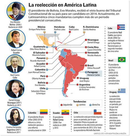 La Razón / EFE / Bogotá.- Cinco de los actuales mandatarios latinoamericanos cumplieron en el poder más de un mandato consecutivo, ganando batallas electorales y judiciales que se enmarcan en la tendencia reeleccionista en Latinoamérica.