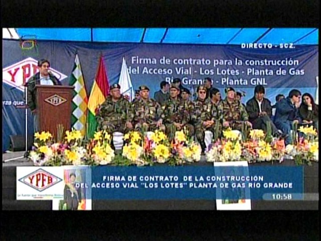 Santa Cruz.- Con la participación del presidente Evo Morales, este jueves YPFB adjudicó la construcción del acceso vial a Rió Grande, Santa Cruz a la Empresa Constructora del Ejército donde se invertirá 42 millones de dólares en 44 kilómetros para el transporte de camiones cisternas de la planta de separadora de líquidos hacia el interior.