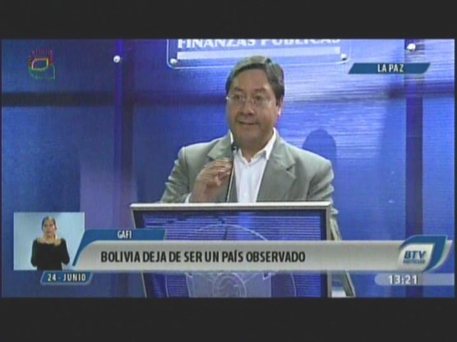 La Paz.- El Ministro de Economía y Finanzas Públicas Luis Arce informó de la decisión del Grupo de Acción Financiera Internacional (GAFI) de retirar a Bolivia cualquier observación por el manejo de la normativa contra el lavado de dinero y financiamiento al terrorismo. Al respecto la autoridad dijo que éste es el reconocimiento al esfuerzo ejercido por más de 7 años por el gobierno nacional.