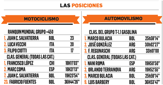 En autos, también subió al podio Luis Barbery, que fue tercero en la T-2 y noveno en la clasificación general, al mando de una Toyota Land Cruiser. “Estamos felices, pues la prueba fue realmente difícil”, sostuvo Barbery. Otro nacional que participó en la competencia fue Fabricio Fuentes, que acabó último entre los 23 pilotos de la general de motociclismo.