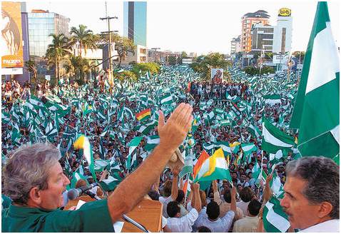 Apoyo. En 2006 hubo el ‘cabildo del millón’ en Santa Cruz en demanda de autonomía. Rubén Costas y el entonces cívico Germán Antelo fueron los protagonistas. La Razón-Archivo.
