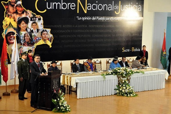 Así concluyo la primera Cumbre de Órgano Judicial que duró dos días y hubo mayor participación de las autoridades del Órgano Judicial y de las organizaciones sociales que conforman el Pacto de Unidad, quienes dieron una tarea a las autoridades judiciales, coordinar una agenda judicial para cambiar el sistema judicial, exigen mayor coordinación entre los poderes del Estado y la justicia indígena, asimismo mayor presupuesto, desconcentración de la escuela de jueces en los nueve departamentos y capacitación a los servidores judiciales, aseguró el presidente del Tribunal Supremo de Justicia, Gonzalo Hurtado.