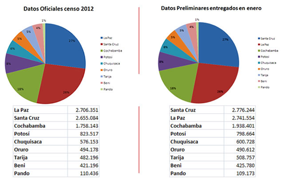 El presidente Evo Morales presentó el 23 de enero los datos preliminares del censo en los que posicionaba a Santa Cruz como el departamento con mayor población, seguido de La Paz y Cochabamba; sin embargo, los nuevos datos demuestran que el departamento paceño desplazó a Santa Cruz al segundo lugar.