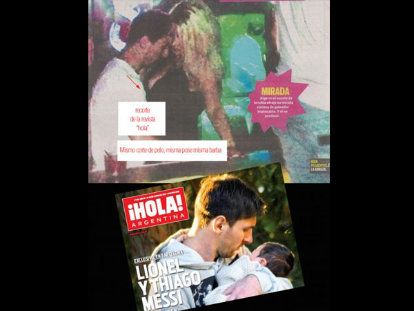 Una de ellas, que muestra a "La Pulga" con su hijo Thiago de ocho meses y la mirada baja, es similar a la que lo encuentra sobre el escote de una voluptuosa mujer rubia,extraída de una portada de la revista ¡Hola! en la que el jugador observa a su niño.