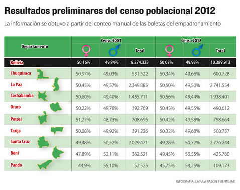 El presidente Evo Morales dio a conocer el 23 de enero los datos preliminares de población, del censo realizado el 21 de noviembre de 2012. En el informe se señaló que el país tiene 10.389.913 habitantes, cifra que reveló un crecimiento poblacional del 26%, equivalente a 2.115.588 bolivianos más que en el censo de 2001.