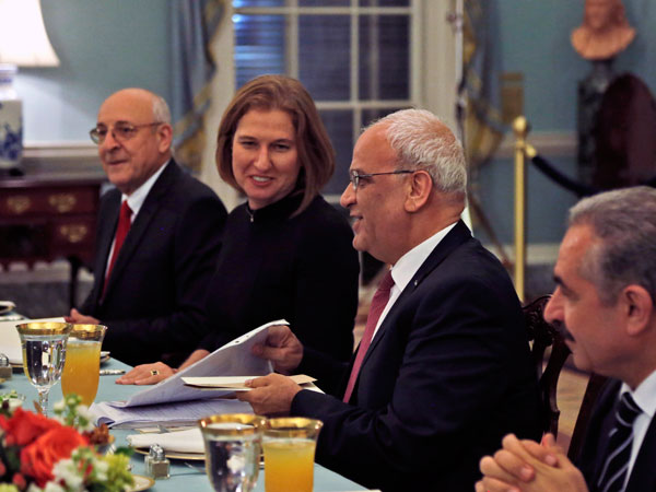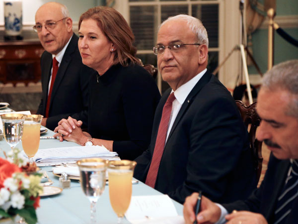 La jefa negociadora israelí, Tzipi Livni, y su par palestino, Saeb Erakat, estuvieron en una cena privada la noche del lunes con el jefe de la diplomacia estadounidenseJohn Kerry.