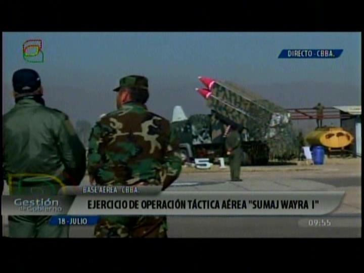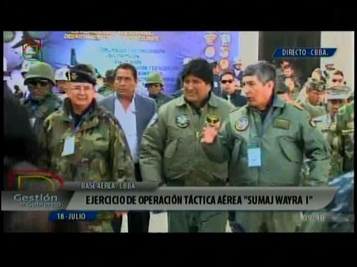 Tv noticias. Cochabamba.- El presidente Evo Morales participa del ejercicio de operación táctica aérea “Sumaj Wayra I” que se inició la mañana de este jueves en la Base Aérea de la ciudad de Cochabamba.