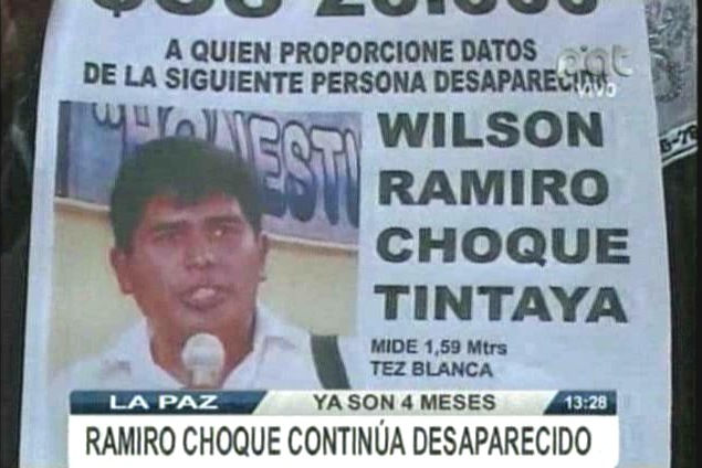 Wilson Ramiro Choque Tintaya, dirigente de las federaciones cocaleras de los Yungas y dirigente del MAS en esa región,  desapareció  el sábado 16 de marzo. La última vez que fue visto fue durante su participación en un congreso regional del Movimiento Al Socialismo en Caranavi.