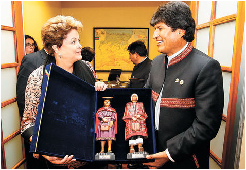 Surinam. El presidente Morales obsequia un presente a la mandataria brasileña, Dilma Rousseff. EFE.
