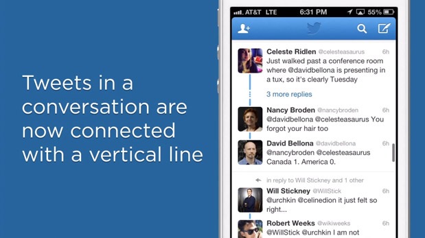 A partir de ahora, el tuit que inicie una cadena de comentarios se mostrará siempre por encima de las respuestas, de forma que nunca más deberás preguntarte a quién están respondiendo tus amigos cuando debatan las profundas implicaciones sociales del twerking.
