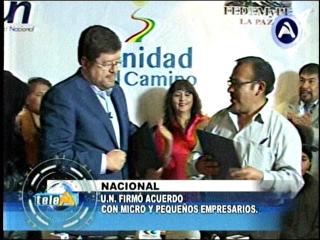 La Paz.- Se ha suscrito un acuerdo entre Unidad Nacional y la Federación de Micro y Pequeños Empresarios, acuerdo denominado “Por una Bolivia unida y productiva”.